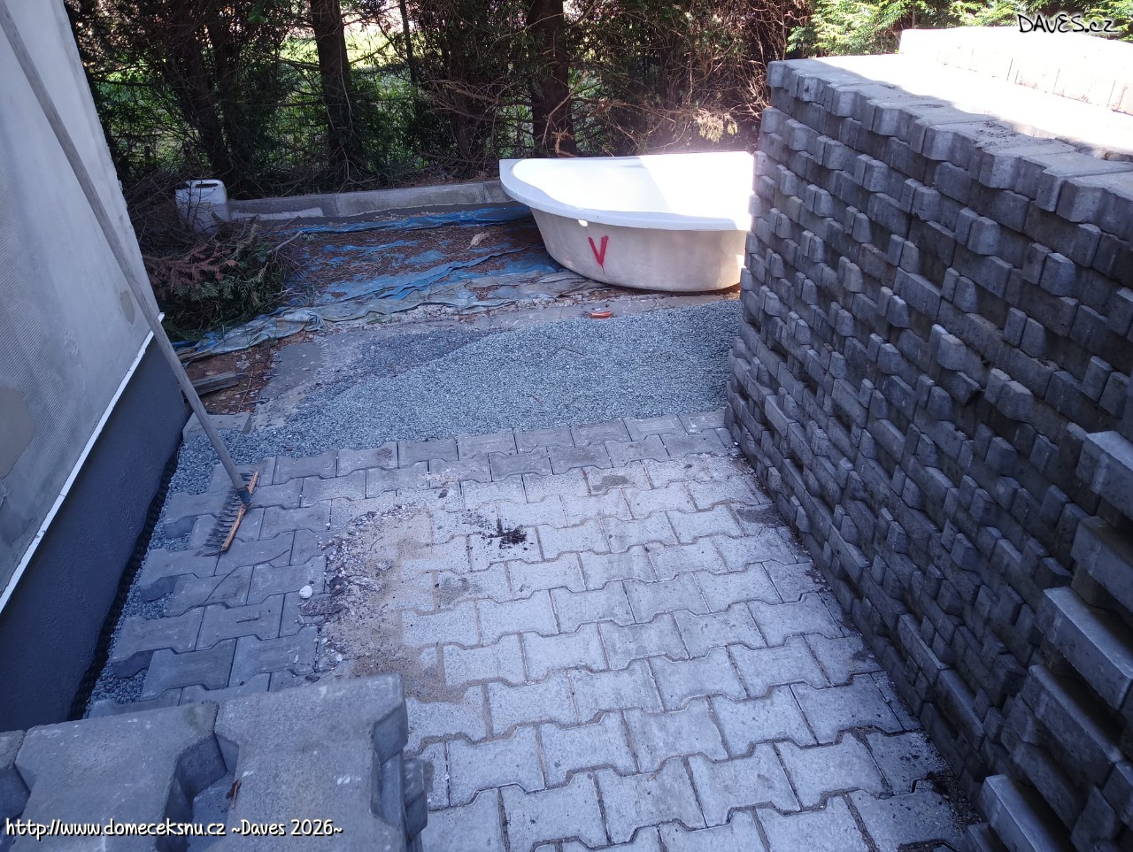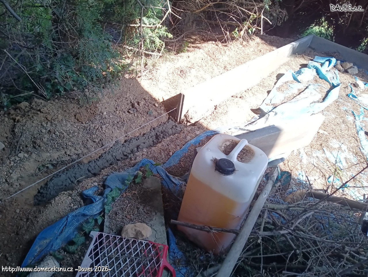 Zabetonoval jsem další obrubník a připravil svod okapu.