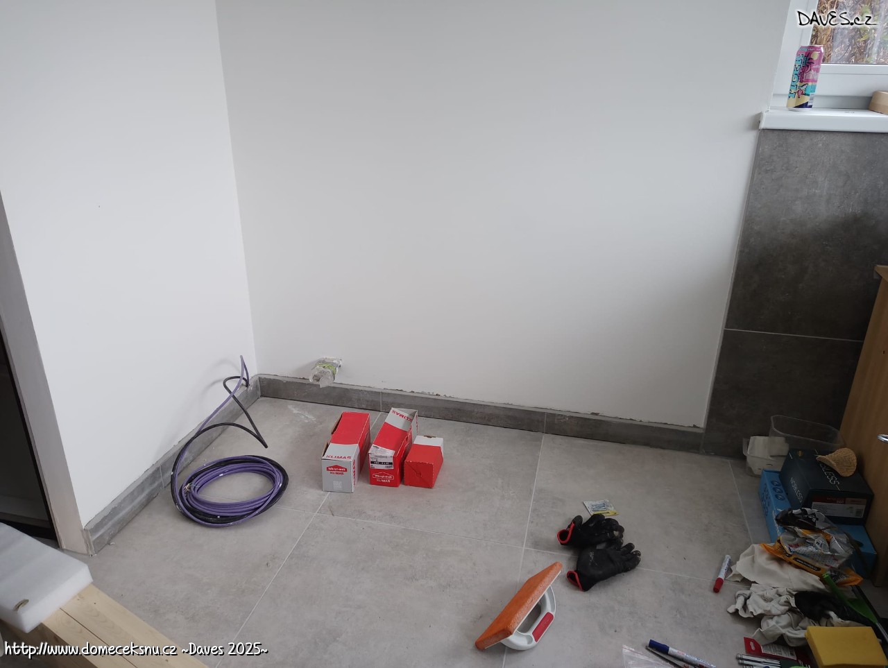 Protože je to pracovna, tak na zeď naházím dlaždičky a bude. Vychází to na délku profilu, jen se asi o dva centimetry zkrátí. Bude to rychlovka. Takže strop, dlaždičky, podlaha a pak se uvidí co dál :)