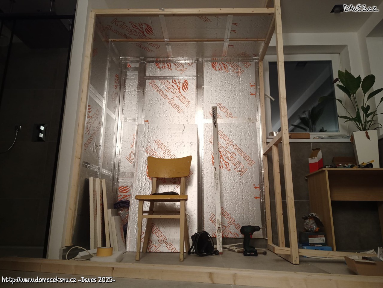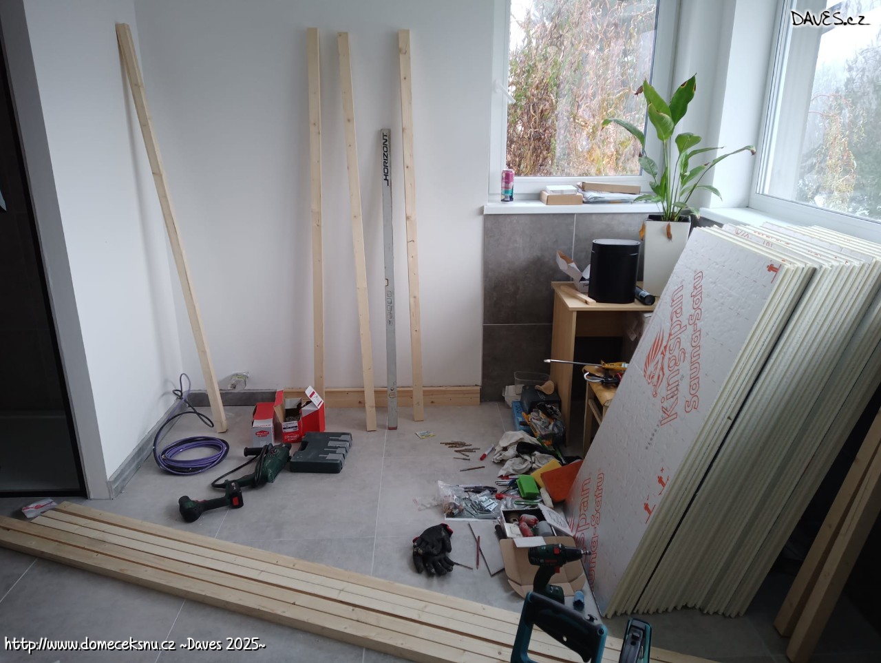 Večer jsem umístil poslední čtverce vaty. Takže snad už konečně konec vaty :) Terezka zametla nahoře neskutečný bordel a poklidila, takže to tam teď začíná vypadat útulně.