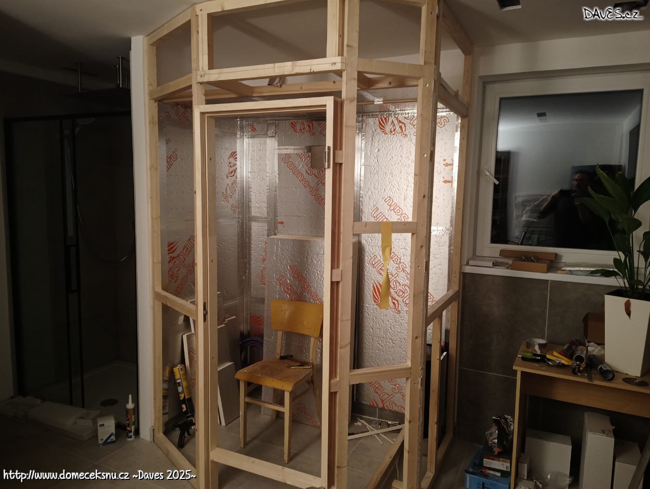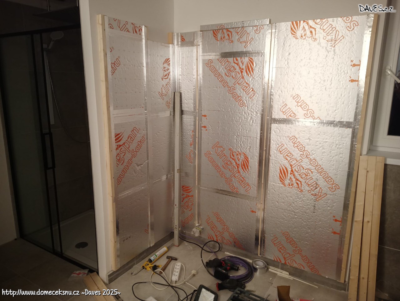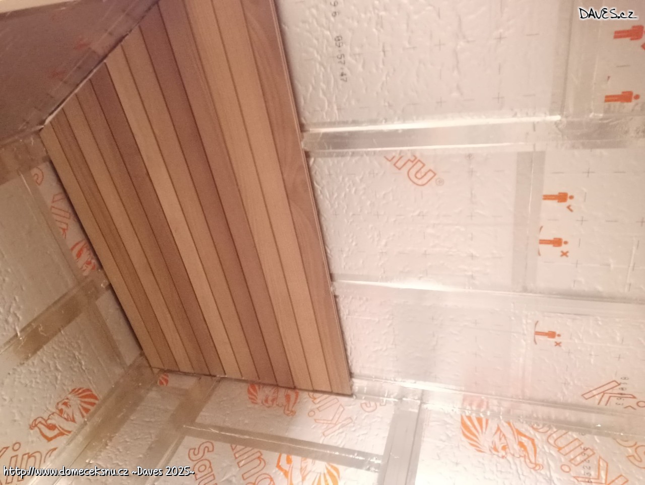 UDčko na svém místě. Koupelna zapáskováno, velká místnost z 1/3. Až budou všechny pásy přelepené k sobě, přijde čas na přímé úchyty. Když se podaří ještě letos, tak super.