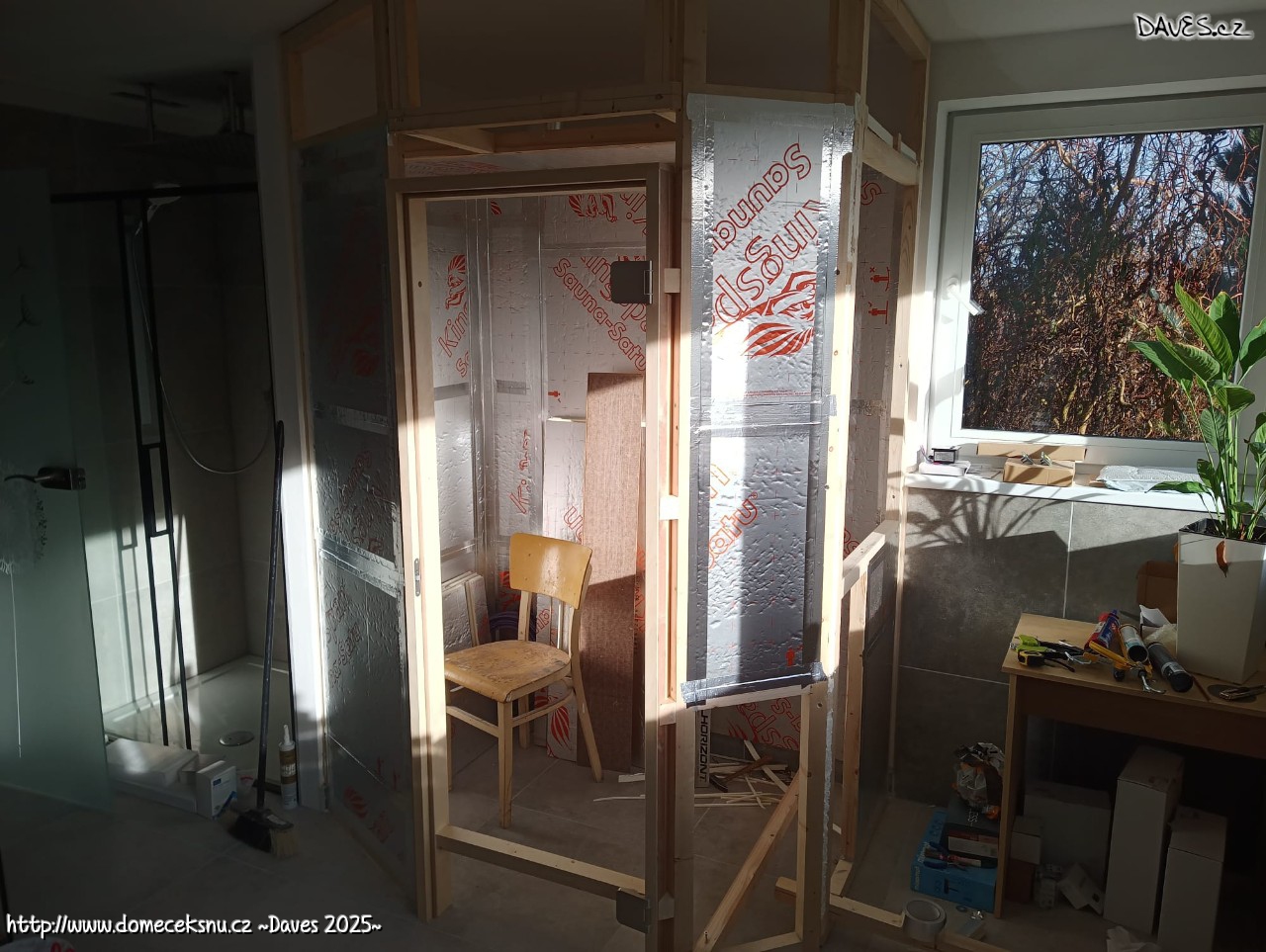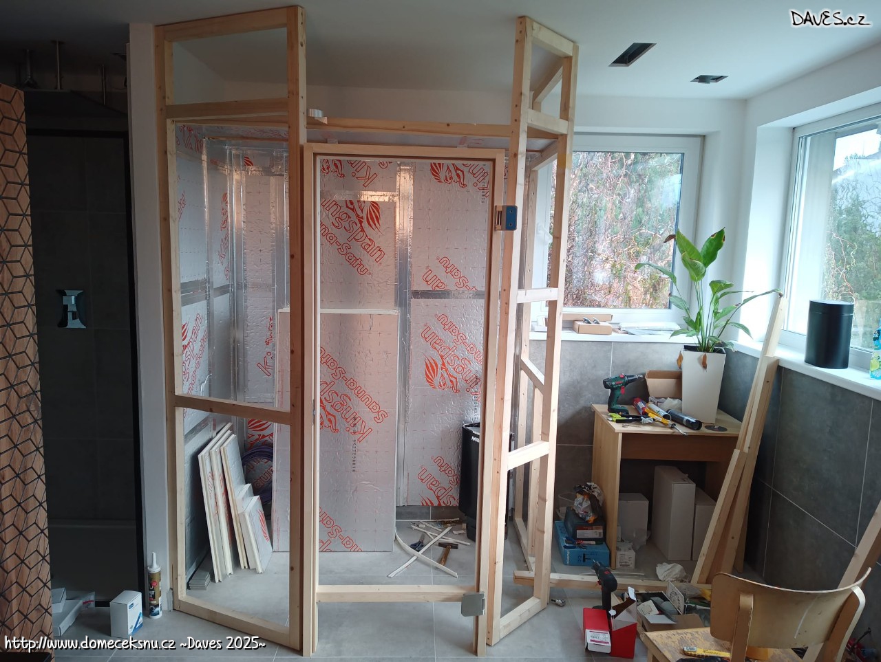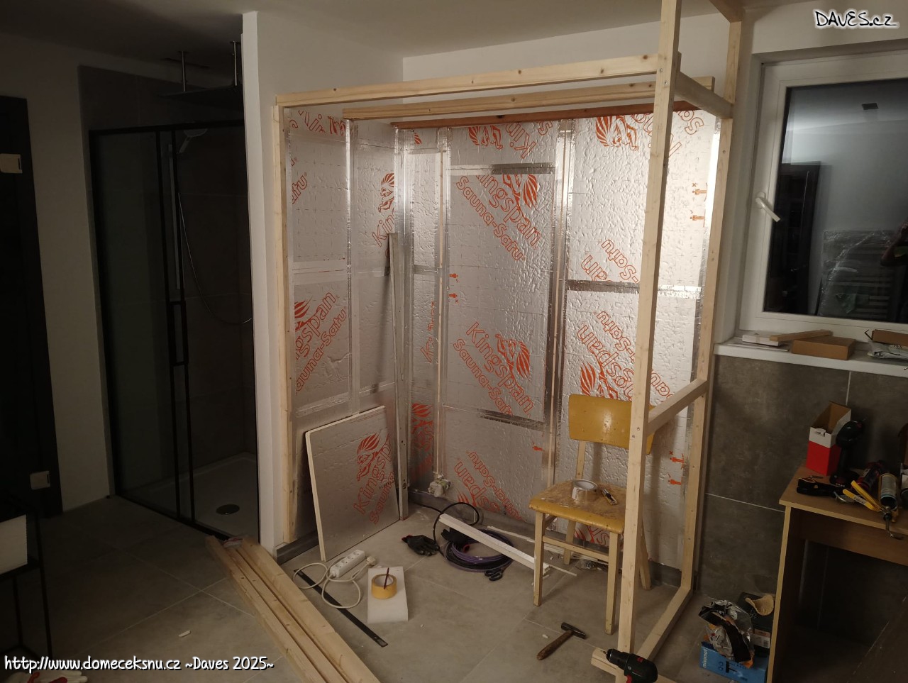 UDčko na svém místě. Koupelna zapáskováno, velká místnost z 1/3. Až budou všechny pásy přelepené k sobě, přijde čas na přímé úchyty. Když se podaří ještě letos, tak super.