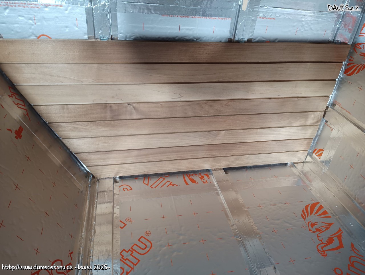 Dolepoval jsem poslední kousky chybějící parozábrany. Ale Terezka nesdílala mé budovatelské nadšení a stěžovala si, že vrtací kladivo dělá velký rámus a bušení do zdi je strašné. A to jsem ty natloukačky zatloukal tak něžně :) Chybí tak stále ještě doladit jeden čtverec a jeden pruh. Práce na tři hodinky. Nicméně vata proschla a střecha je bez kondenzace. Pokrok.
